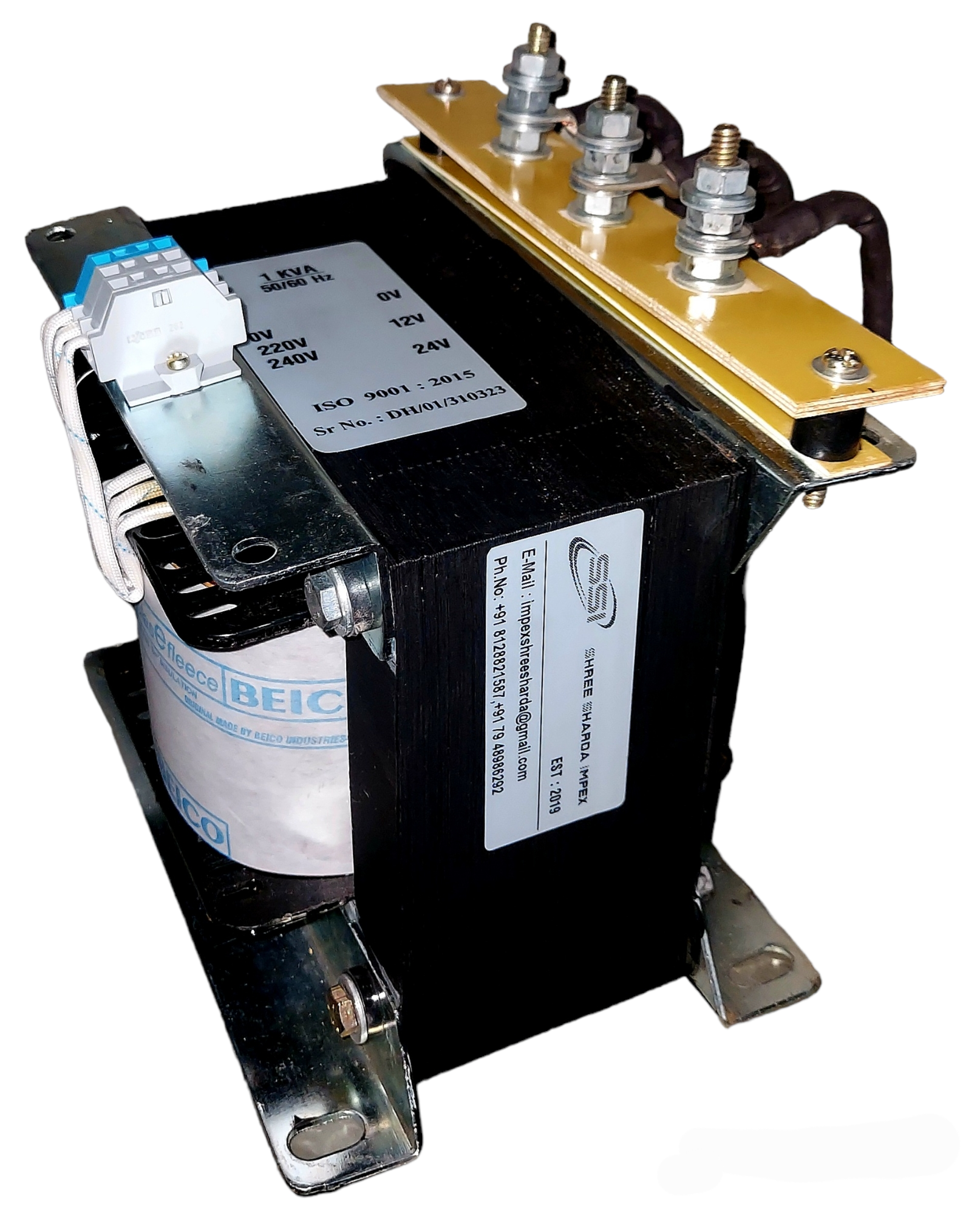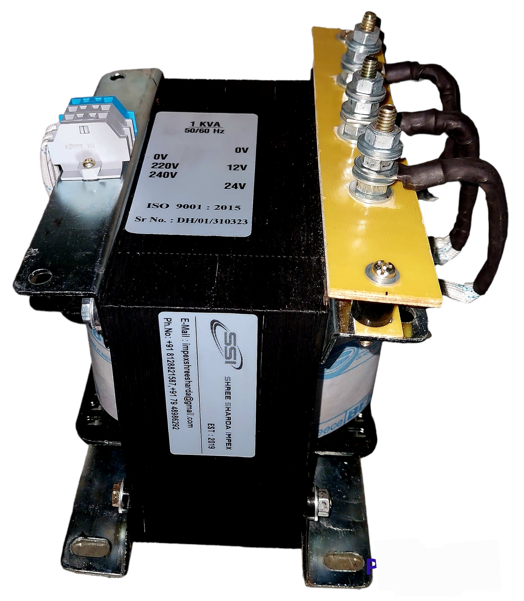 1 KVA - 1.Phase - 50/60Hz, 240/24V, Copper Wound, Class: F insulated, IS 12021, ISO 9001 : 2015 Low voltage, High Amp. Transformer for special Requirement as per demand.